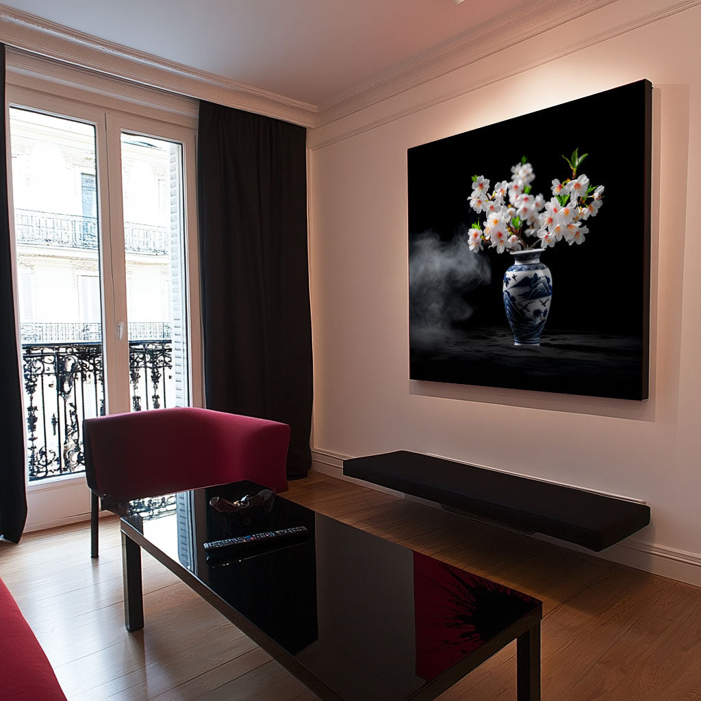 Stilleven van Japanse bloemen in porcelijnen vaas.