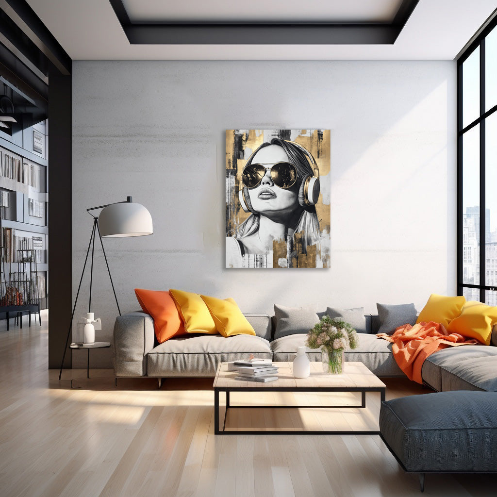 Een portret van een vrouw in collegestijl. De goudtinten maken dit werk tot een geliefd object aan de muur.