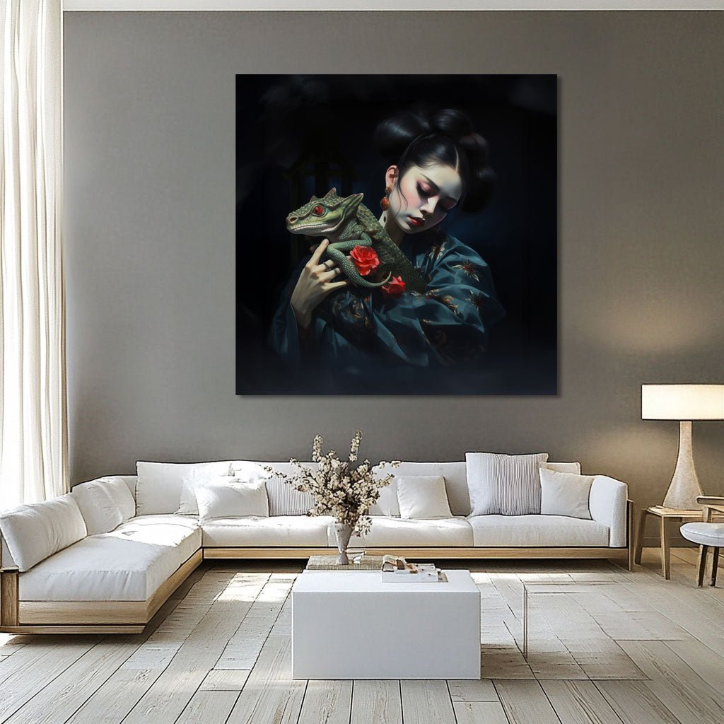 De lieflijkheid van de Aziatische vrouw staat bijna in schril contrast met de draak die zij vasthoudt. Traditionele elementen in een modern jasje.